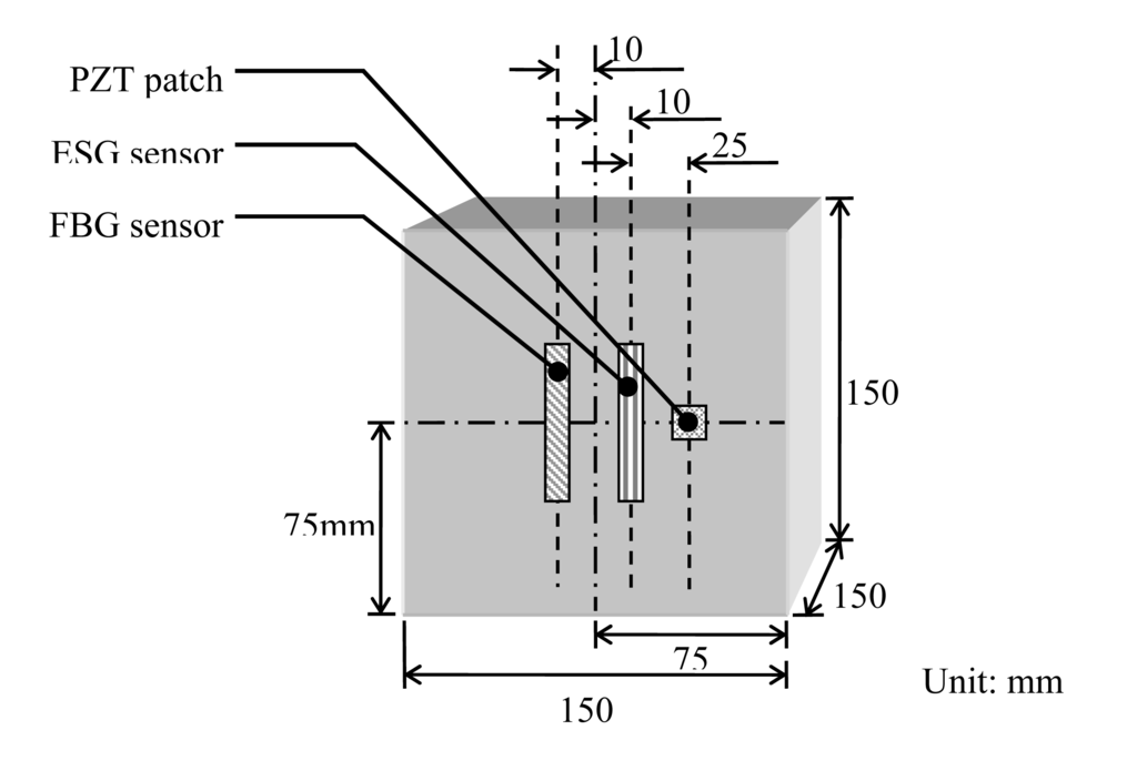 A total of three rock specimens (1, 2 and 3) were cut to obtain 150mm cubes from the blast fragments (mostly granite) from a underground construction site in Singapore. All three specimens were instrumented with ESG, PZT and FBG sensors on four side surfaces, leaving the top and bottom surfacees for compression purpose as shown in Figure 3.