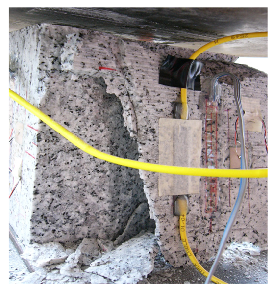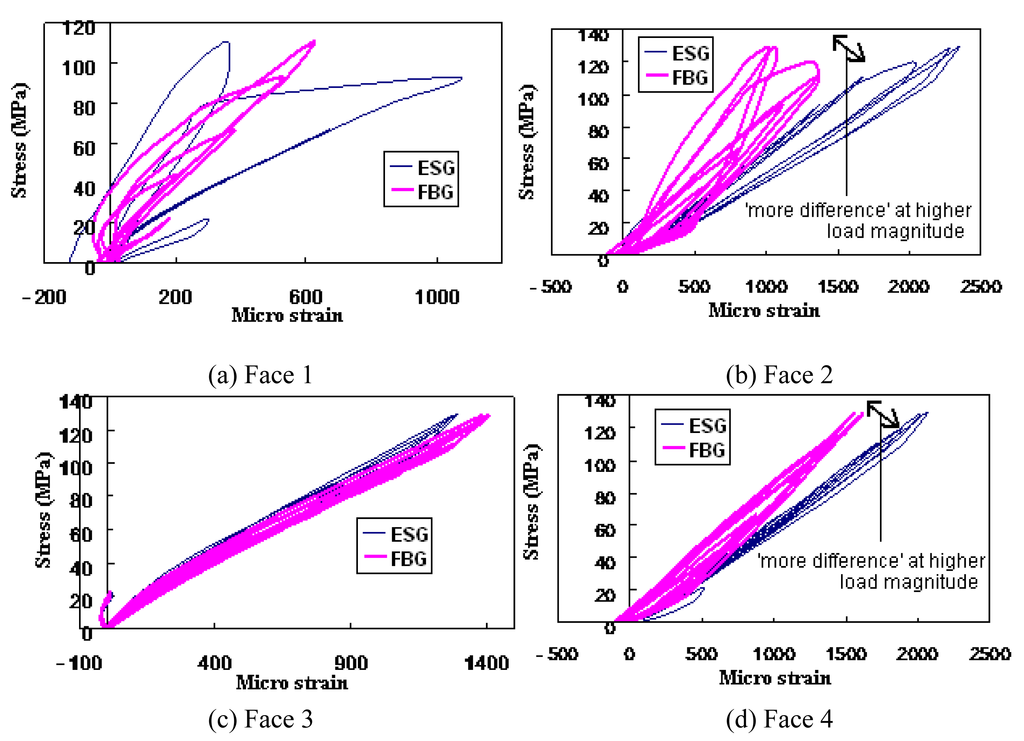 Figures 5, 6 and 7 show the comparison of the stress-strain history of four faces of Specimens 1, 2 and 3 obtained by the ESG and FBG sensors, respectively. However in Figure 6, the strain readings exhibit some abnormality after a few load cycles. The stress-strain curves from the FBG and ESG sensors for Face 1 of Specimen 2 started to show increasing hysteresis and slope after load cycle 1, thus indicating that the area close to the sensors may have developed some damage. Hence, close attention was paid to the surface of this particular face during the test but no obvious cracks were observed. However, during load cycle 6, a loud noise was heard followed by the shearing off of Face 1. The damage was captured and can be seen in Figure 8. Since the fault lies on a plane parallel to the plane of the strain measurement, the stress-strain behaviour was not suitable for the indication of such a potential damage.