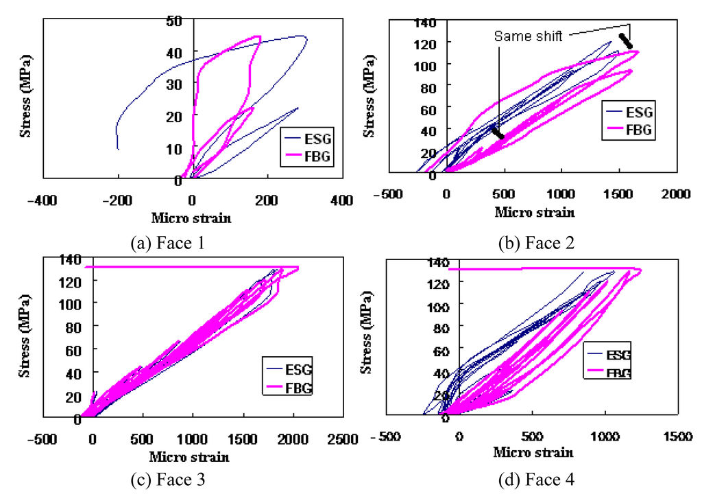 In addition, some slight changes in strain history for Faces 2 and 4 of Specimen 3 were observed, i.e., FBG had resulted higher strain variations as compared to ESG (Figure 7). This is because, even though both type of sensors were placed at approximately symmetric locations (Figure 4) the pressure of loading might be a little eccentric (not exactly at the centre) on the specimen. Hence a downward shift of the FBG curves was noticed as compared to the ESG curves for Faces 2 and 4. Nonetheless, the stress-strain curves for all specimens obtained from FBG and ESG sensors match well, i.e., the strain history retrieved by the ESG sensors is similar to that by the FBG strain sensors, which demonstrates the effectiveness of FBG sensors for strain measurement of rocks.