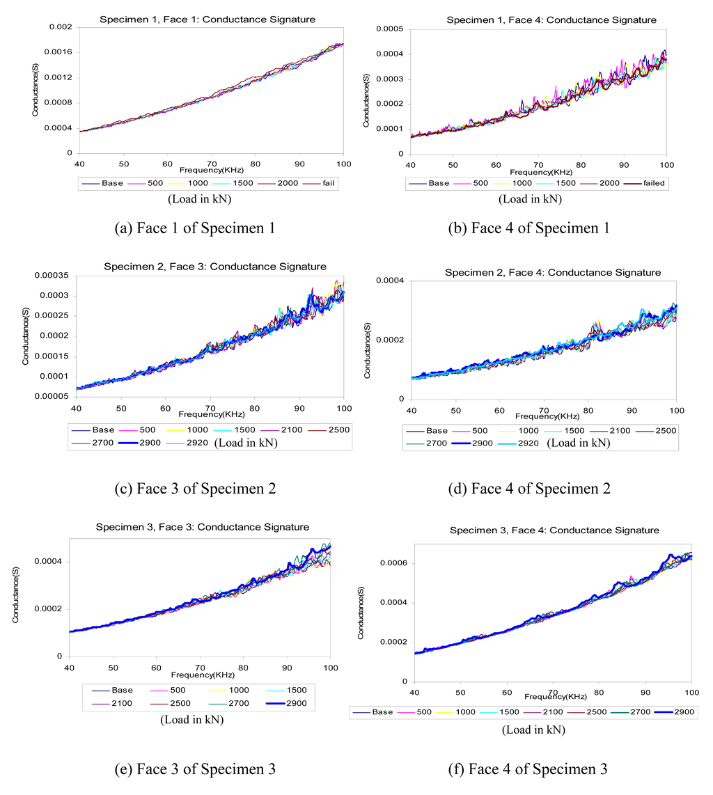 Figure 9 shows the typical experimental conductance signatures for the three test specimens. Figures 9(a,b), (c,d) and (e,f) show the signatures recorded until failure of Specimens 1, 2 and 3, respectively. The respective failure loads are 2765 kN, 2920 kN and 2900 kN. The damage level in the specimens can be assessed by using the root mean square deviation (RMSD). The RMSD values calculated from the conductance signatures for all the faces of Specimens 1, 2 and 3 are shown in Figure 10. Figure 10(a) shows that for Specimen 1, Face 1 was the last to fail because its RMSD value is the smallest as compared to Faces 2, 3 and 4. In fact, it was observed from the RMSD indices that the order of failures should be Face 2 first, followd by Faces 3, 4 and 1. This is in accordance with the experimental observation. Similarly, the variations for the RMSD values of Specimens 2 and 3 also matched the experimental observations. The above experimental results indicates that based on the PZT conductance signatures, the RMSD index could be a good indicator for failure sequence in rocks. Further research work is desirable to confirm this finding.