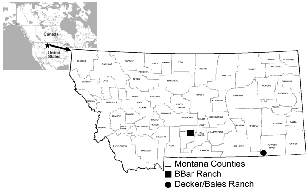 Study site locations in Montana, and Montana's location in North America. BBar ranch is located in Sweet Grass County and Decker/Bales ranch is in Powder River County.