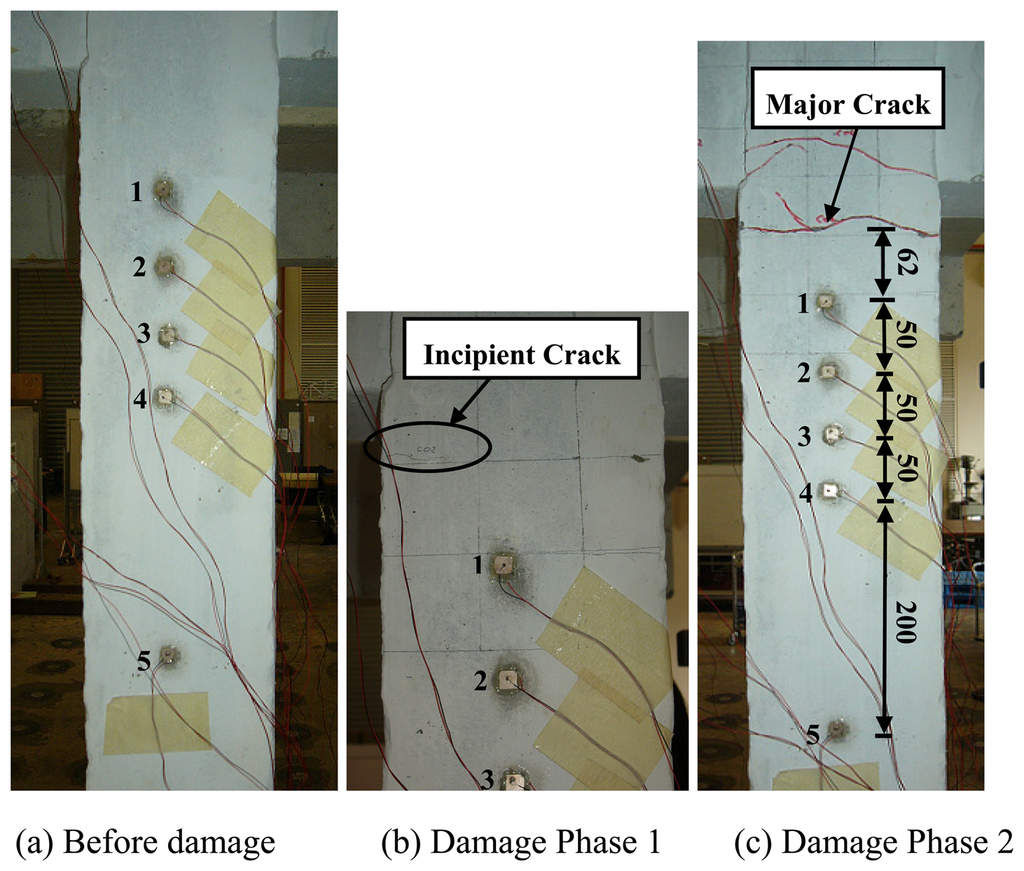 | Patch Number | Distance from joint O along the column as shown in Figure 2 | Distance of the PZT patch from the main crack |