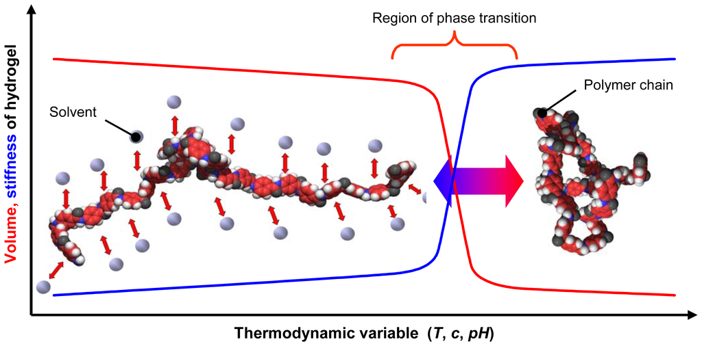 Unlike “normal” solvophilic polymers stimuli-responsive hydrogels exhibit a first-order- or a continuous (also called second-order) phase transition behaviour. As illustrated in Figure 1 they exhibit two phases. A separated phase of the gel is dominated by polymer-polymer interactions. In this case the gel reaches its maximal value of hydrophobicity and shrinks. The second phase, a mixed phase, is characterised by solvent-polymer-interactions, which aspire the best mixing of polymer and aqueous solution. Therefore, within the mixed phase the hydrogel gains its maximum of hydrophilicity and swells. Close by the phase interface a small alteration of a thermodynamic variable, namely a solvent concentration, results in a change of the phase characterised by an abrupt change in physical properties of hydrogel, especially in volume, mass, stiffness and more.