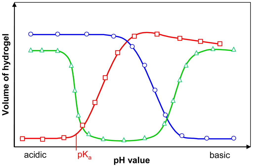 resulting in a decrease of both the charge density and the content of mobile counterions within the hydrogel leading to gel shrinking [37]. The phase transition of the gels occurs in a small range close by the apparent acid dissociation constant pKa of the hydrogel which is mostly identical with the pKa of the ionisable group. Approximately at the apparent pKa of the gel the ionisation begins accompanied by a drastic swelling of the hydrogel. If the ionisation of the ionisable component is completed the swelling process stops. Further pH increase only increases the ionic strength. This decreases the osmotic pressure and leads to shrinking of the gel (see Figure 2, acidic hydrogel). That figure shows the general behaviours of the three types of polyelectrolyte gels.