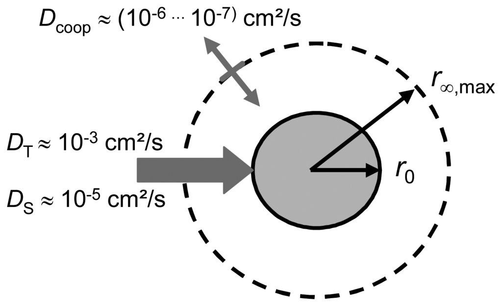 First, the initiating stimulus has to be transferred into the hydrogel, such as temperature difference, solvents or ions, which is associated with a change of the balance of the osmotic pressure. The transport occurs either energetically by heat transfer (described by the thermal transfer coefficient, DT) or by continuous mass diffusion of a solvent into the hydrogel (described by the spontaneous mass transfer coefficient, DS) shown in Figure 3. Then as a second mechanism, to obtain the swelling equilibrium of the changed osmotic pressure balance, the hydrogel swells or shrinks absorbing or releasing swelling agent. Concomitantly, the polymer chains of the network have to be moved to obtain their new positions. Comprising both the solvent diffusion and the net chain motion TANAKA and FILLMORE developed the model of “collective” or “cooperative” diffusion characterised by the cooperative diffusion coefficient Dcoop [40-42].