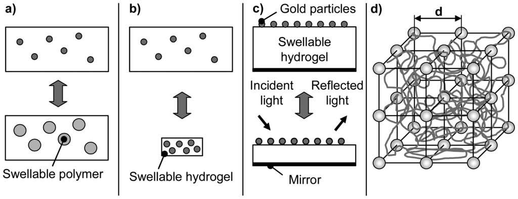 a) Swellable hydrogel particles, entrapped into a membrane, change the optical transmission of the sensing element (according to [44]); b) Changes in hydrogel swelling change the density and spacing of entrapped particles; c) Changes in thickness of a hydrogel structure displace reflective layers. d) Changes in hydrogel volume change the lattice spacing d of a crystalline colloidal array.