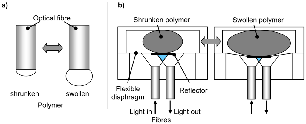 By such devices the swellable polymer is coupled to a reflector (see Figure 5b). Changes in polymer volume cause the reflecting diaphragm to move, which in turn changes the intensity of light reflected back into the optical fibre [68,69].