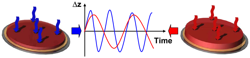 Applying electric field quartz crystals can be stimulated to oscillate stable in their resonance frequency. Loading of the quartz resonator results in changes of the resonance frequency (Figure 6). This frequency shift is the base of the quartz crystal micro balance principle. In our own work quartz crystal micro balance is used as a transduction element to monitor changes in the properties of thin hydrogel layers [64]. An increase in the surface load of a quartz crystal should theoretically induce a decrease of the resonance frequency. However, it was observed a frequency shift increasing with increasing mass and volume of hydrogel. Essentially, both the stiffness and the density of the hydrogel strongly decrease by swelling and thus increase its volume and mass. As a consequence, the effective surface load which is swinging decreases during the swelling process. Changes in mechanical properties of the hydrogel coating of the quartz cause changes in damping of the signal amplitude. This damping can be used as second data acquisition channel. The damping decreases with increasing hydrogel swelling.