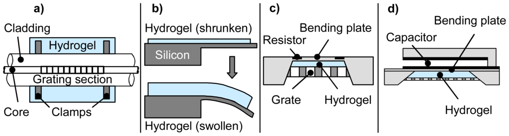 ZHANG et al. presented hydrogel based fibre optic BRAGG grating sensors [70,71]. By swelling, the hydrogel pushes the clamps fixed on the fibre BRAGG grating (Figure 7a). This results in a physical stretch of the fibre which expands the grating period. When the hydrogel shrinks the BRAGG wavelength decreases.
