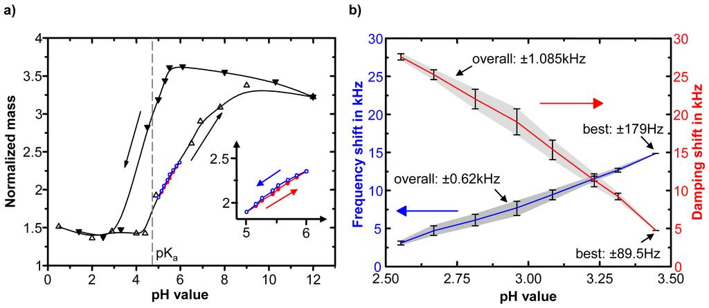 - Richter, A.; Bund, A.; Keller, M.; Arndt, K.F. Characterization of a microgravimetric sensor based on pH sensitive hydrogels. Sens. Actuat. B 2004, 99(2-3), 579–585. [Google Scholar]