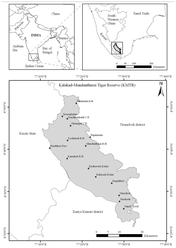 Geographic position of the Kalakad–Mundanthurai Tiger Reserve (KMTR), South Western Ghats, located in the Tirunelveli and Kanykumari districts of Tamil Nadu, (India).
