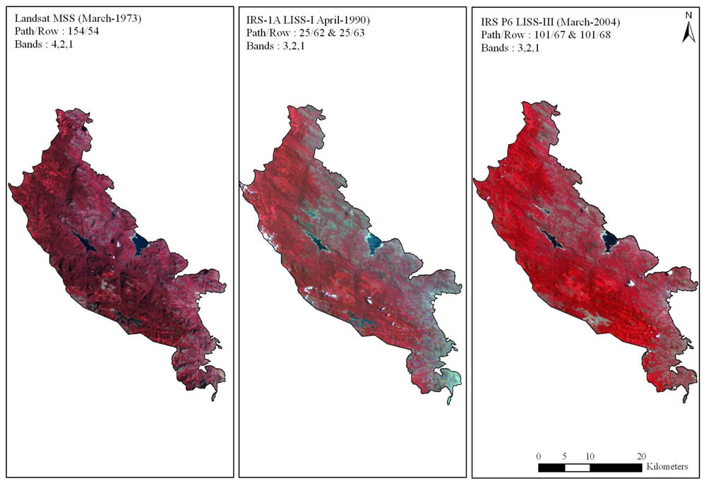 Cloud free data of LANDSAT Multispectral Scanner (MSS) of March 1973 covering path and row 154/54 was obtained from USGS, EROS Data Center, Sioux Falls, SD, IRS-1A LISS I satellite data of April 1990 and IRS-P6 LISS III satellite data of March 2004 covering path and rows viz. 101/67 and 101/68 from National Remote Sensing Agency, Hyderabad (Figure 2). LANDSAT-MSS data with a spatial resolution of 80m and the spectral wavelength (B1 0.5 – 0.6, B2 0.6 – 0.7, B3 0.7 – 0.8 and B4 0.8 – 1.1 μm), IRS-1A LISS I with a spatial resolution of 72.5m and the spectral wavelength (B1 0.45 -0.52, B2 0.52 - 0.59, B3 0.62 - 0.68 and B4 0.77 - 0.86μm) and IRS-P6 LISS-III with a spatial resolution of 24m and the spectral wavelength of four bands (B2 0.52 – 0.59, B3 0.62 – 0.68, B4 0.77 – 0.86 and B5 1.55 – 1.70μm) were analyzed in the study. Prior to geometric correction satellite images were radiometrically corrected for subsequent analysis.