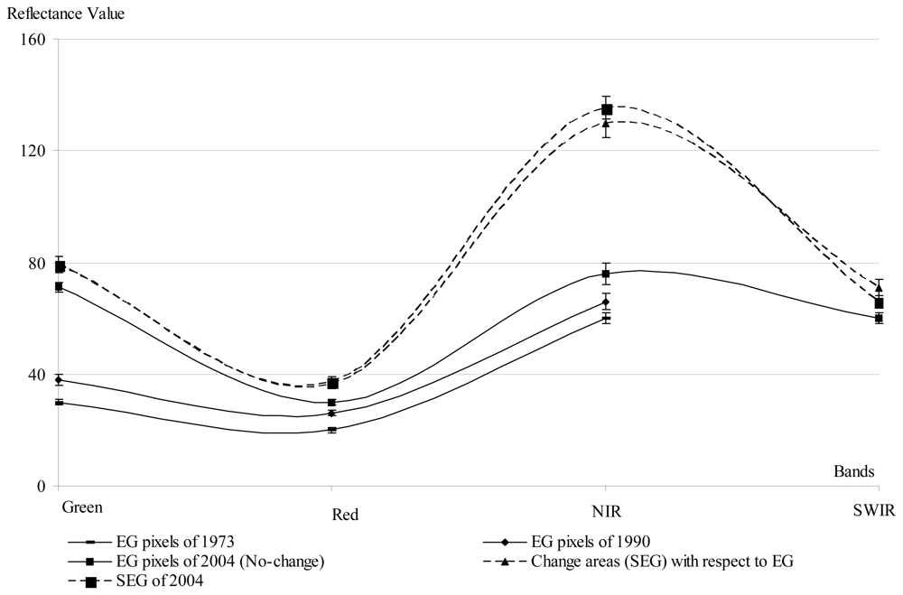 The initial vegetation type map of 2004 (LISS-III) was characterized using supervised classification technique based on the information of terrain, topography and species database collected during landscape-biodiversity characterization program for Western Ghats [20]. Based on the 2004 vegetation type map inputs, an area of interest (AOI) of evergreen patches in 1973 was selected using MSS data assuming that these patches had remained unchanged from 1973 till 2004. The reflectance properties has similar trends in the evergreen and semi-evergreen patches for both the satellite images (Figure 3).