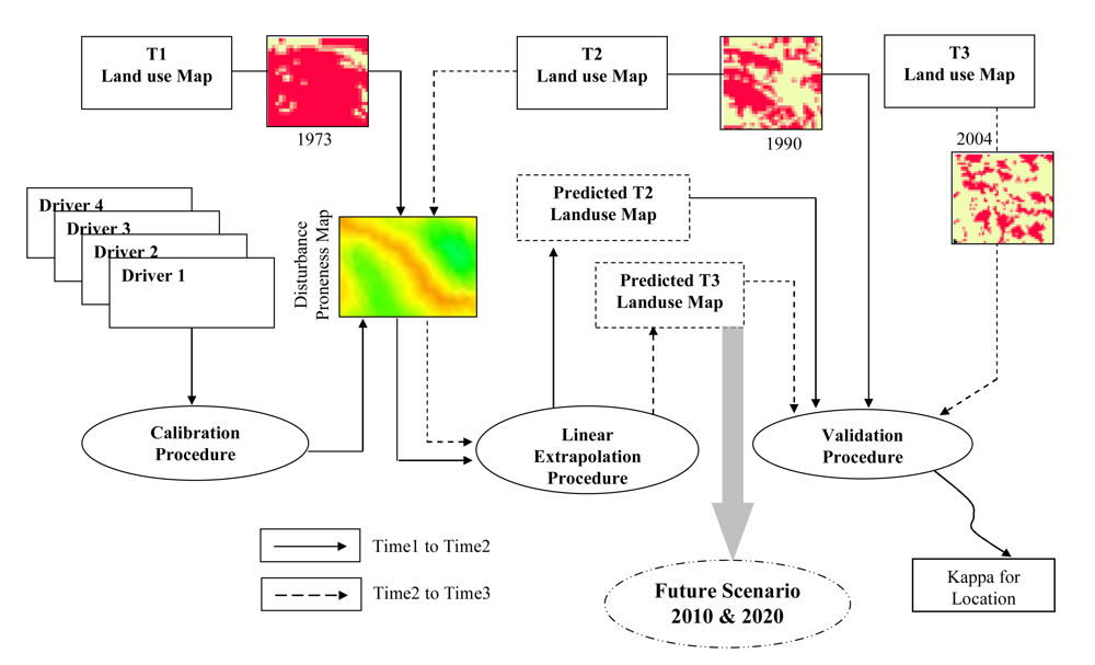 An approach which combines time series evergreen forest areas change between 1973 and 2004 and future change of its location and quantity was modelled within the geographical modelling (GEOMOD) framework (Figure 4). GEOMOD is a simple unidirectional linear change modelling tool [22] that uses suitability image/s, produced by combining a variety of driver images to predict locations of change for given quantity of change between two time periods. User re-runs GEOMOD trying to obtain higher and higher values of Kappa. Once user decides to accept a result, GEOMOD can use the “suitability” map and the selected weights to model the land cover of a future year based on only attributes. The most interesting part of this type of change modelling is in its ability to model location specific change for different quantities of change.