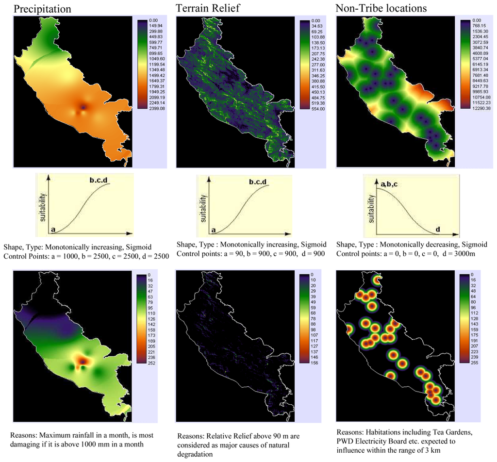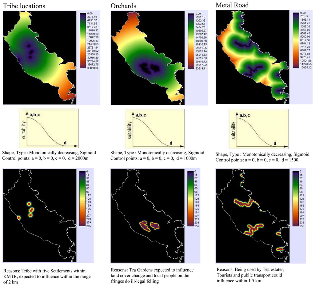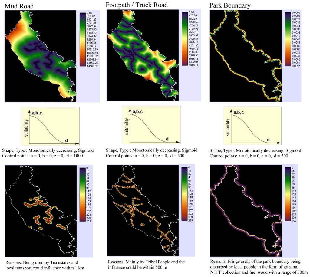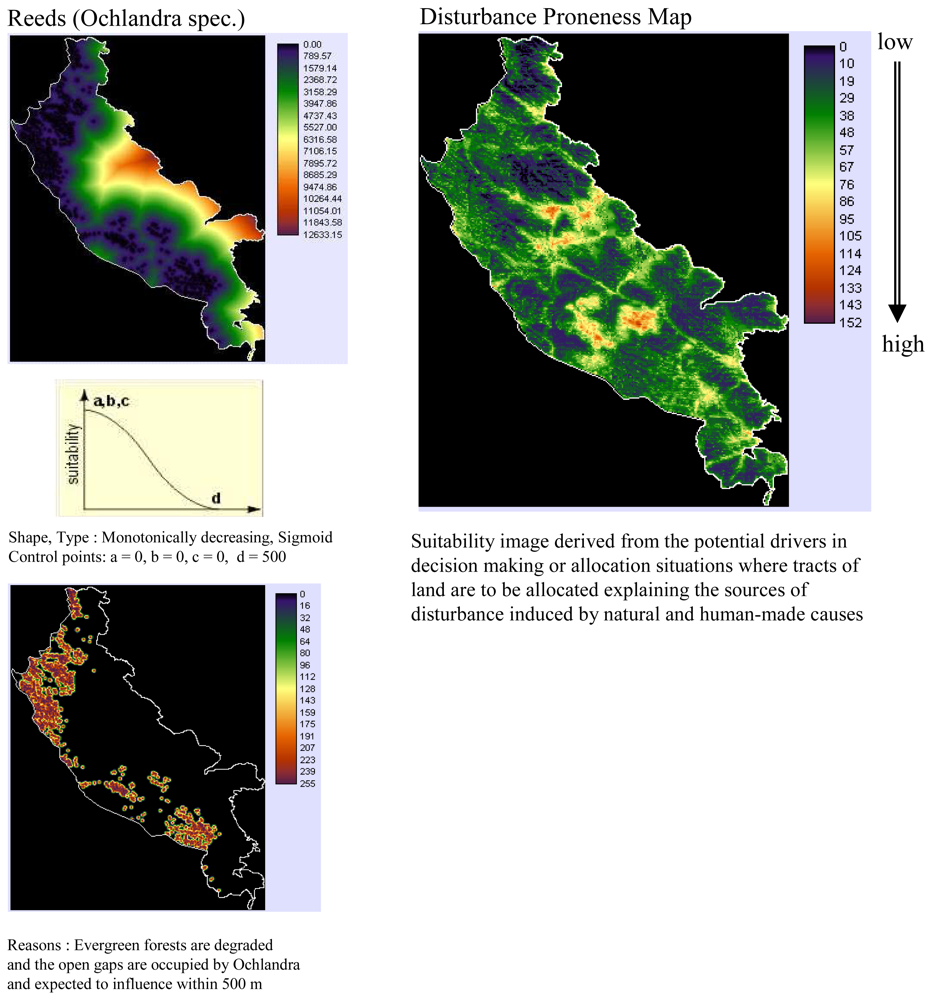 Multi-criteria evaluation (MCE) a decision support tool was used to generate suitability image to identify evergreen forest areas prone to change. Fuzzy based membership function with its shape and type was used to detect the pixels which are suitable and not-suitable for change. For e.g., DEM which uses membership function as symmetric and type as sigmoid where the altitude between 600 to 1,300 m are identified as the least degraded areas. Ground information was randomly collected for all the potential drivers used in this study as an input source for multi-criteria decision wizard. Time series inputs along with suitability map were used in Geographic Modelling (GEOMOD) framework to predict future areas of change for its conservation planning and restoration of tropical rainforest system. Similar approaches were carried out in Bannerghatta National park (India) to identify deforestation rate and also proposed modelling as a tool for conservation of forest resources and its sustainable management [34].