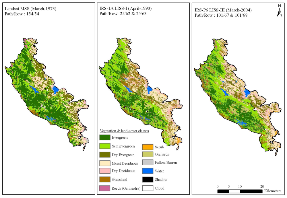 Taking the above criteria into consideration 1973 MSS image and 2004 LISS-III image were used to generate the LULC maps of 1973 and 2004 respectively. Likewise all the spectral classes were assigned training sets from the geometrically corrected images and were then classified. The maximum likelihood algorithm was used to classify these scenes [21]. Major forest types delineated were viz. tropical evergreen, semi-evergreen, moist deciduous, dry deciduous, dry evergreen, grasslands, scrubs, reeds (Ochlandra sp.) and orchards. The tone and textural differences in these forest types can be clearly seen in satellite imagery (Figure 2). The classified vegetation map was validated by verification on ground and found to be 85% accurate. Finally, IRS LISS-III dataset were re-sampled to 80m (equivalent to MSS) to facilitate comparison.