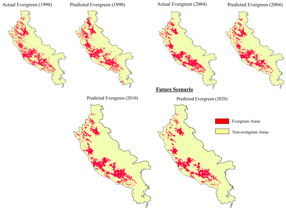 Comparison of actual and predicted evergreen forest change between 1990 & 2004 using GEOMOD modelling and also the future scenario map of 2010 & 2020 for the study region (KMTR), South Western Ghats, Tamil Nadu (India).