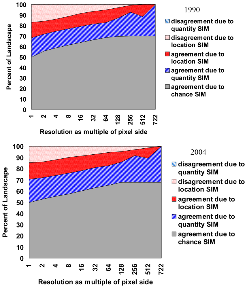 To validate the results created by GEOMOD, the actual evergreen map at a known point in time is compared with the predicted evergreen map of that same time based on analysis of the pattern at an earlier point in time using “Validation” tool available in IDRISI module. In the past, measures of the ‘goodness of fit’ commonly were performed by using a simple percent correct measure or, at best, a multiple-resolution percent correct [24-25] but this provides little assessment of a model's ability to predict the correct quantity of change versus its ability to identify the correct location of change [22, 26]. Spatial measures of ‘goodness of fit’ have been developed that measures the degree to which a simulated map agrees with a reality map with respect to both location (Kappa-for-location) and quantity of correct cells (Kappa-for-quantity).