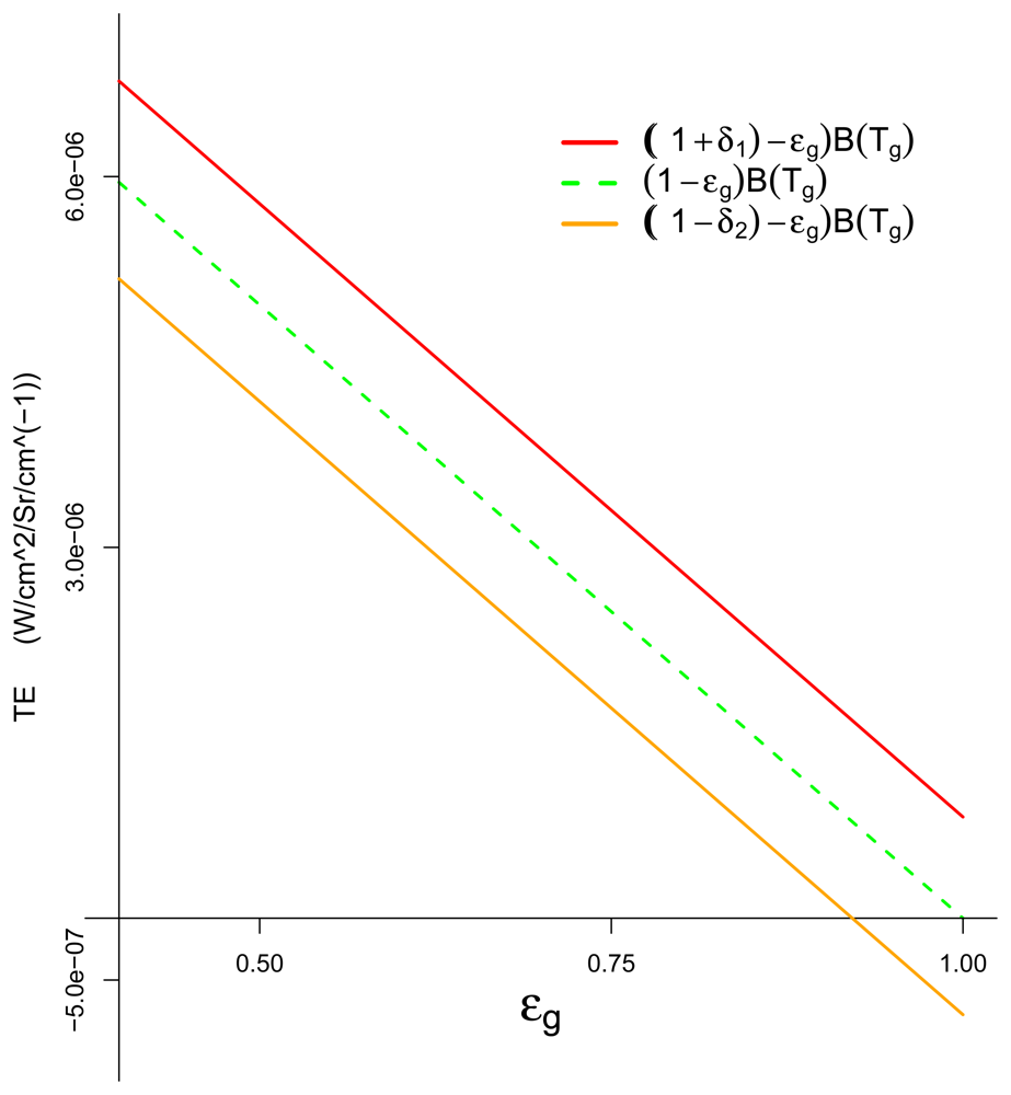 Eq. (11) is also easy to interpret as a function of ϵg. First, we note that because δ1 (ν) is positive when Tp > Tg and is additive in TE, it can be shown that TE is strictly positive for this temperature case. This says that the plume is strictly in emission for this case. It also says that a larger chemical signal is observable compared to the previous temperature case. Since ϵg(ν) is subtracted in Eq. (11), small emissivities yield a larger chemical signal at wavenumber ν.