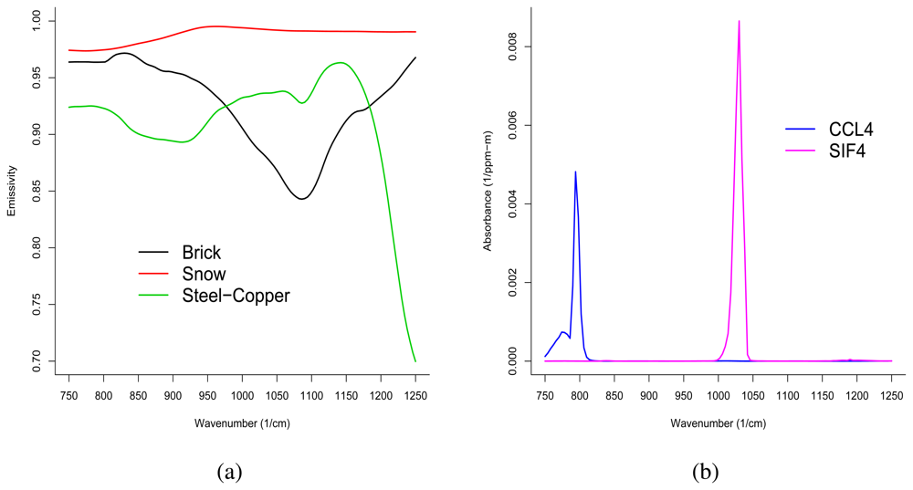 Two gases were selected for image simulation. We selected Carbontetrachloride (CCL4) and Tetraflo-urosilane (SiF4). These gases exhibit one large dominant absorbance feature. A plot of the absorbance spectra for these gases is presented in Figure 2(b). The spectrum for CCL4 shows a major feature around 790 cm–1. SiF4 exhibits a dominant feature around 1025 cm–1. Note that the background emissivities show a consistent ordering across type (they do not cross) where each of the chemicals exhibits positive absorbance.