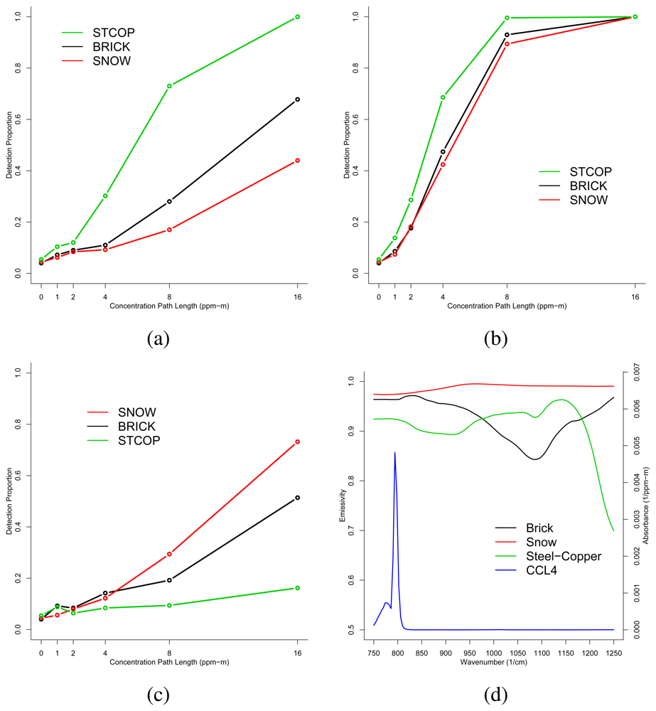 We use pˆ as an estimate of the gas detection probability. We get 18 detection probabilities for each image as there are three backgrounds and six gas-concentration path-length levels. Lastly, we plot detection proportions versus concentration path length and look for orderings (conditioned on background emis sivity) in these curves. We then interpret these results back to the claims to the effect that background emissivities should produce a larger chemical signal and better detectability for each chemical.