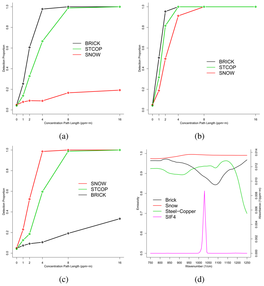 Now we consider Figure 4(a), which is a plot of the empirical detection curves for SiF4 when Tp = Tg = 300K. Examination of the plot shows that the backgrounds can be ordered from best to worst detectability for SiF4 as Brick, Steel-Copper, and Snow. Figure 4(d) shows that the background emissivities can be ordered from least to greatest as Brick, Steel-Copper, and Snow where SiF4 exhibits its dominant absorbance peak. This ordering is consistent with the analysis of TE: smaller emissivities yield a larger chemical signal for this case.