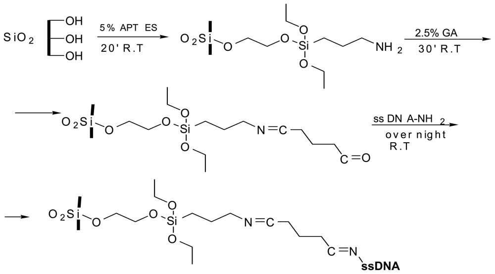 The covalent bond of the DNA single strand (5'-GGACTTGCCCGAATCTACGTGTCC-3') on the PSi surface is based on a three steps functionalization process constituted by a chemical passivation of the surfaces, as it is shown in Figure 2 (all the chemicals used in the present study were from Sigma). We have treated the surfaces with a proper chemical linker, the aminopropyltriethoxysilane (APTES). Samples have been rinsed by dipping in a 5 % solution of APTES and a hydroalcoholic mixture of water and methanol (1:1) for 20 min at room temperature. After the reaction time, we have washed the chips by deionized water and methanol, and dried in N2 stream. The silanized devices were then baked at 100 °C for 10 min. To create a surface able to link the amino group of the biological probes, we have thus immersed the chips in a 2.5% glutaraldehyde (GA) solution in 20 mM HEPES buffer (pH 7.4) for 30 min, and then rinsed it in deionized water and finally dried in N2 stream. The GA reacts with the amino groups on the silanized surface and coats the internal surface of the pores with another thin layer of molecules. All these reaction steps have been monitored by means of FT-IR spectroscopy to verify the presence of the characteristic peaks of the organic linkers. The main characteristic peaks of Si-O-Si (1040 cm-1) and Si-OH bonds (3740 and 1646 cm-1) are present, after oxidation, on the PSi. After the silanization process, the APTES characteristic peaks of the ethylic (at 1626, 1529 and 1379 cm-1), amino (at 1060 cm-1) and also the – CH (at 2908 and 2851 cm-1) groups are well evident. Finally, after the GA treatment, the characteristic imine group (at 1627 cm-1) due to the reaction with APTES is easily recognized.