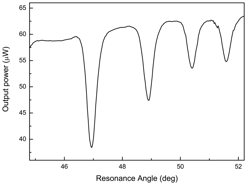 The PSi waveguide, once oxidized in order to reduce the scattering losses [11] and to allow the bond with biological linkers, has been characterized by means of “m lines” technique, which determines the modal behavior of the waveguide at different wavelengths and estimates the refractive indices nc and nb for the core an the buffer layers [12]. In Figure 3, is reported a standard m-lines spectrum due to the excitation of four adjacent modes in transverse electric (TE) polarization of the electromagnetic field at 785 nm: by measuring the coupling angles position is possible to quantify the core and cladding thicknesses and refractive indexes. We have obtained the refractive indexes of core and buffer and the thickness of the core equal to nc = 1.370 ± 0.001, nb = 1.18 ± 0.01, and dc = 2.71 ± 0.01 μm respectively. It is important to notice the strong reduction of the refractive indexes after the thermal oxidation process, mainly due to the substitution of silicon with silicon dioxide.