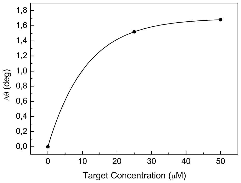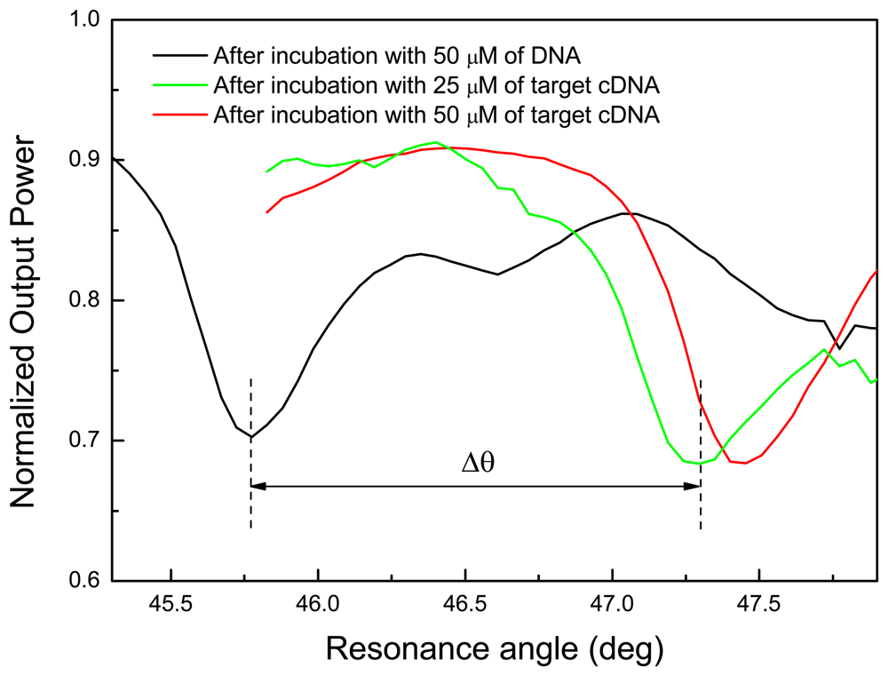 In Figure 5, the results of angular measurements after incubation with probe DNA and after two steps of the DNA hybridization process at two different concentrations are reported: the resonance shifts confirm the effectiveness of the DNA binding.