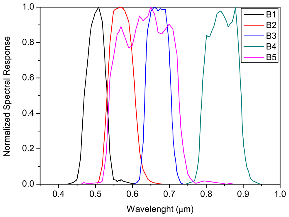 Figure 1 shows the actual spectral response of the CCD/CBERS-2B bands. These curves were originated from spectral measurements performed in laboratory taking into account the response per radiance unit. In Figure 1 the data have been normalized (from 0 to 1) to facilitate relative comparison between bands.