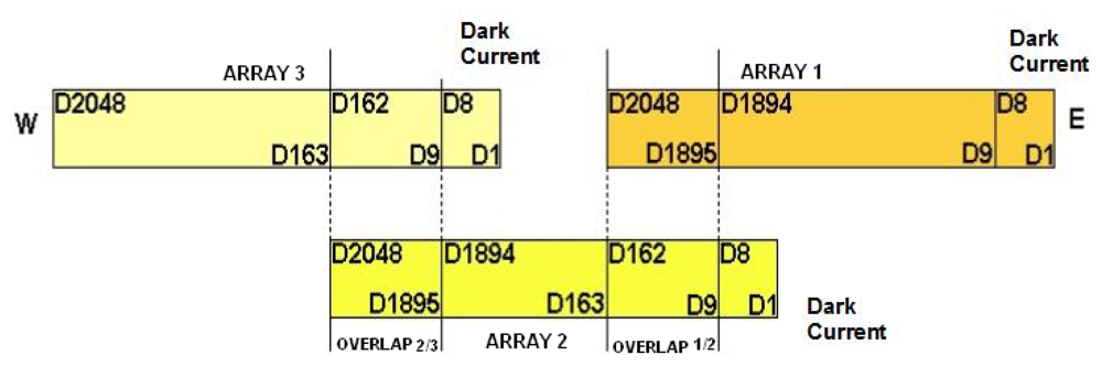 According to Figure 2, the CCD/CBERS-2B detector array arrangement consists of three arrays of 2,048 detectors (or pixels) with two overlap regions of 154 detectors and a dark current region of 8 detectors in each array. These arrays are positioned inside the camera as a “divoli” [4] conception guaranteeing the complete and continuous cross-track imagery. This conception is the same adopted in the Haute Resolution Visible sensor (HRV) on board of the SPOT satellites.