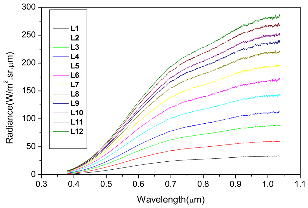 Just before the CCD/CBERS-2B absolute calibration procedure, the integrating sphere characterization was performed using a calibrated radiometer (running from 380 to 1050 nm) positioned in a way where the radiance was measured through the same 45° inclined mirror. Twelve illumination levels (radiance levels) from the integrating sphere were considered in its characterization as well as in the CCD/CBERS-2B calibration. Figure 3 shows the spectral radiance (Lλ) values for each illumination level measured with the radiometer. These illumination levels were defined taking into account the non-saturation ranges per spectral band in order to guarantee the linear relationship between radiance (Lλ) and DN values.