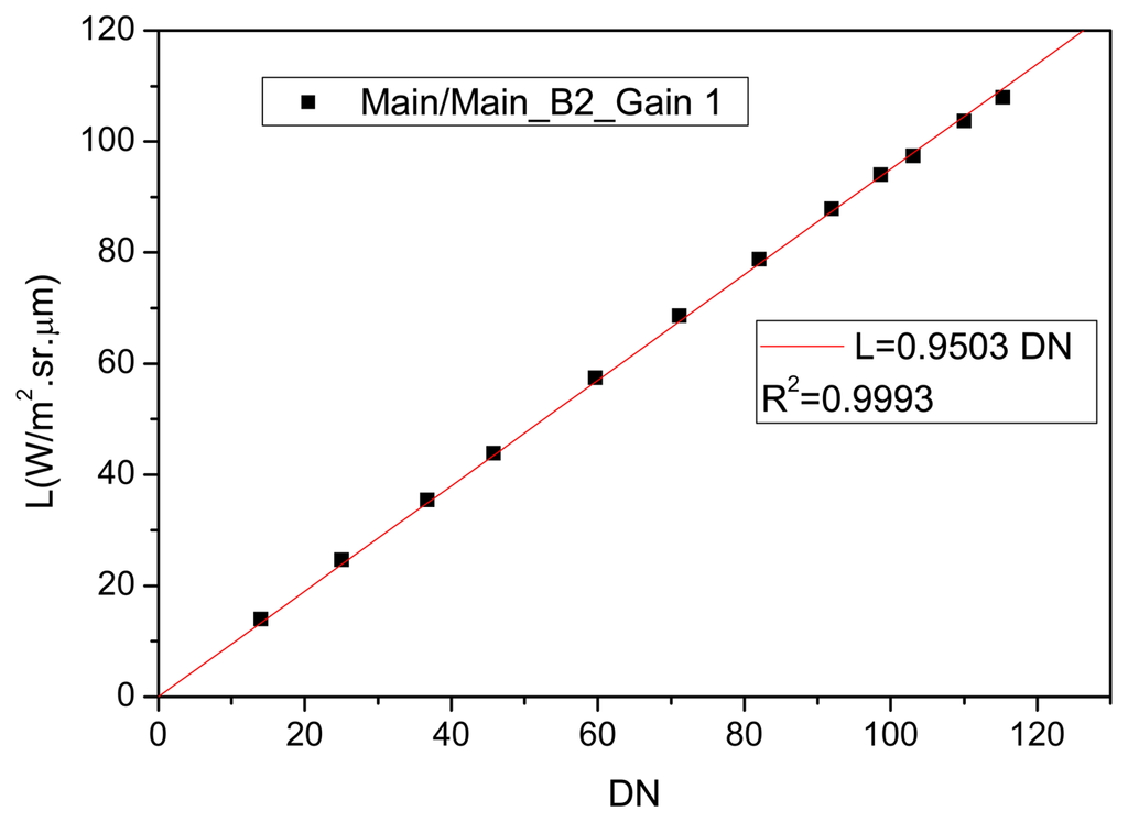 The absolute calibration coefficients were determined by the relation Lccdi/DNi, where “i” represents the CCD/CBERS-2B spectral band. Figure 5 shows an example of the absolute calibration coefficient determination considering the Figure 4 data (main-main sub-system combination, CCD2 and gain 1).