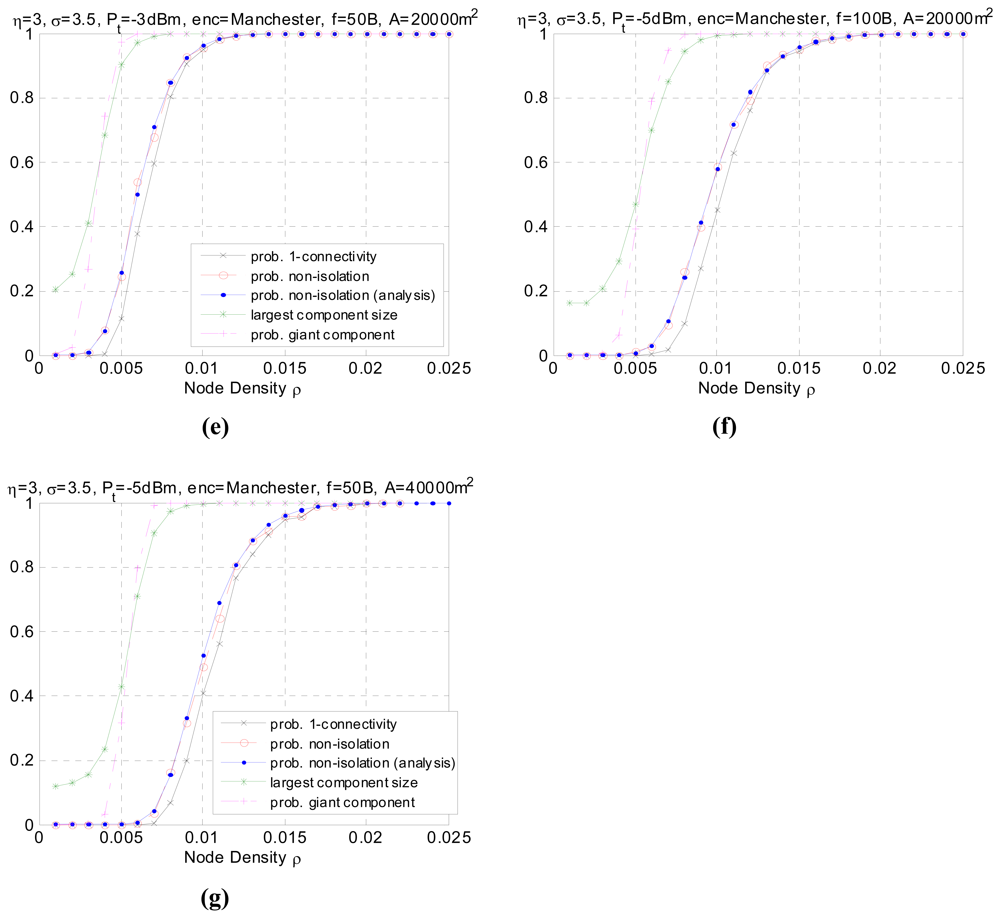 - Figure 5(f) shows the connectivity performance as the packet size is doubled. It can be observed that the performance merges to 1 at a slightly higher node density. The impact of packet size on the global connectivity is not obvious compared to other parameters.