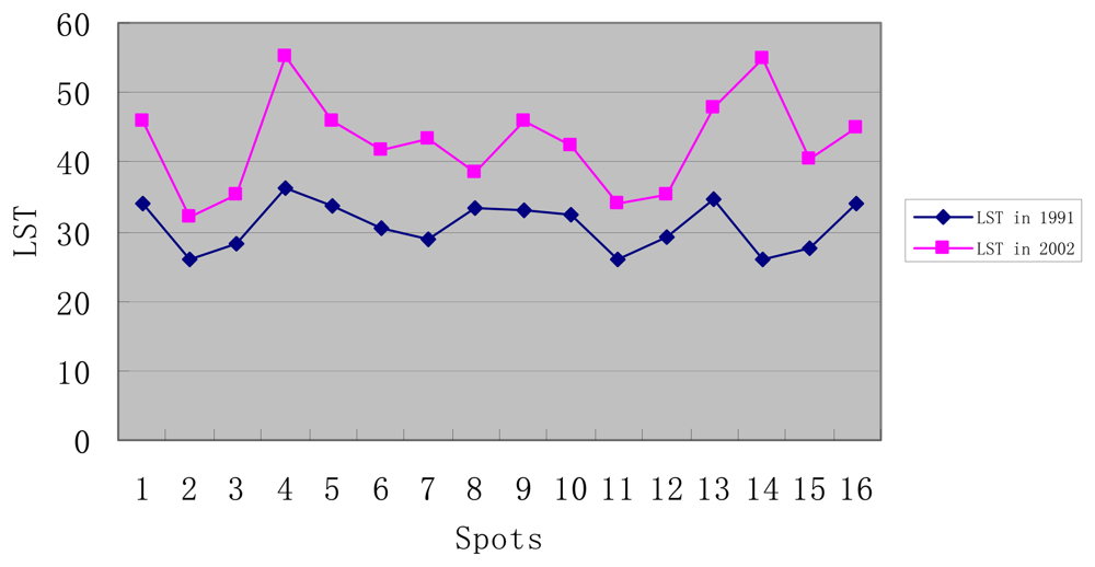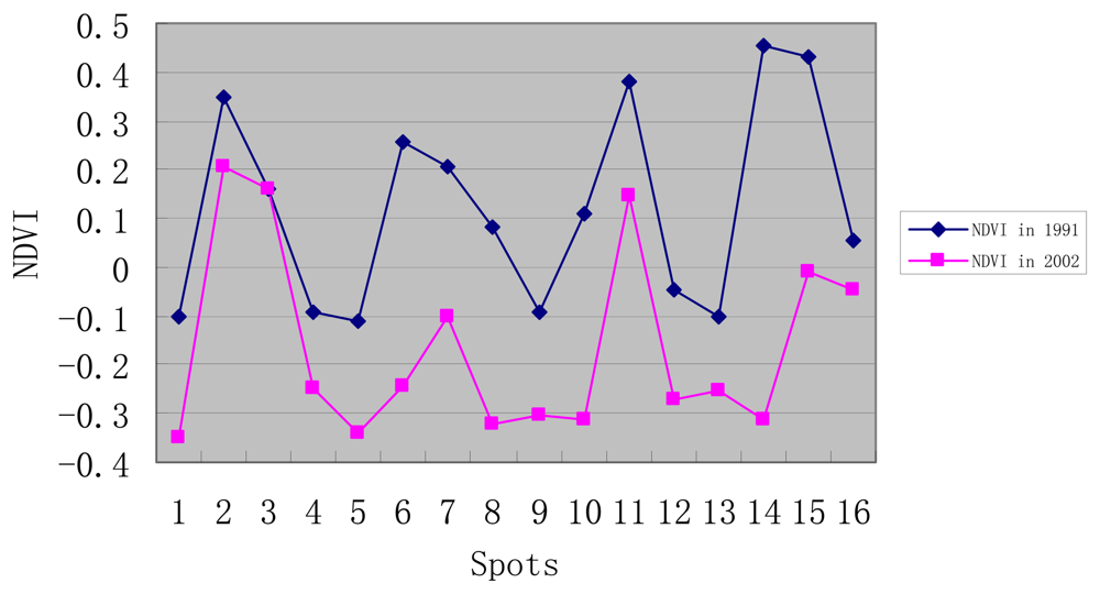 The city area of Wuhan in 1991 was much smaller and building density was also lower. On the contrary, the NDVI index in 1991 was much higher than that of 2002. The minimal NDVI index of main city region in 1991 was -0.541, its maximal value was 0.699 and the mean value was 0.046. The minimal NDVI index in July 9th, 2002 was -0.964, the maximal value was 0.640 and the mean value was -0.169. For the further study, 16 typical regions are selected from satellite images to do the comparison of NDVI index and land surface temperature between these two periods. These typical regions represent various surfaces in city. Table 3 shows the results.