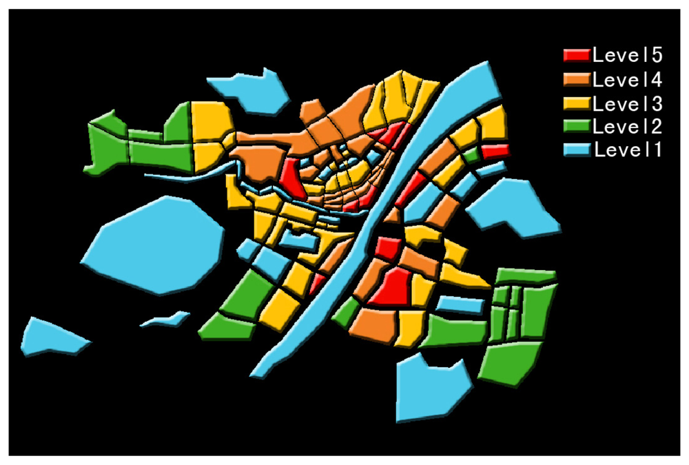 City grading according to the conditions of different city zones such as real building combination and vegetation terrain is an important parameter setting. Traditional city grading is based on experience and has strong subjectivity [16]. However, referring to the land surface temperature image of RS technology, city blocks can be subdivided into different grades according to the heat island level classified by land surface temperature and different boundary conditions are assigned accordingly. These may raise the simulation accuracy to reflect the real structure of urban heat island. Figure 3 shows the city level setting made by the above idea and the levels from five to one show the classification of underlying surface from nuclear heat island region to natural surfaces of gardens and water.