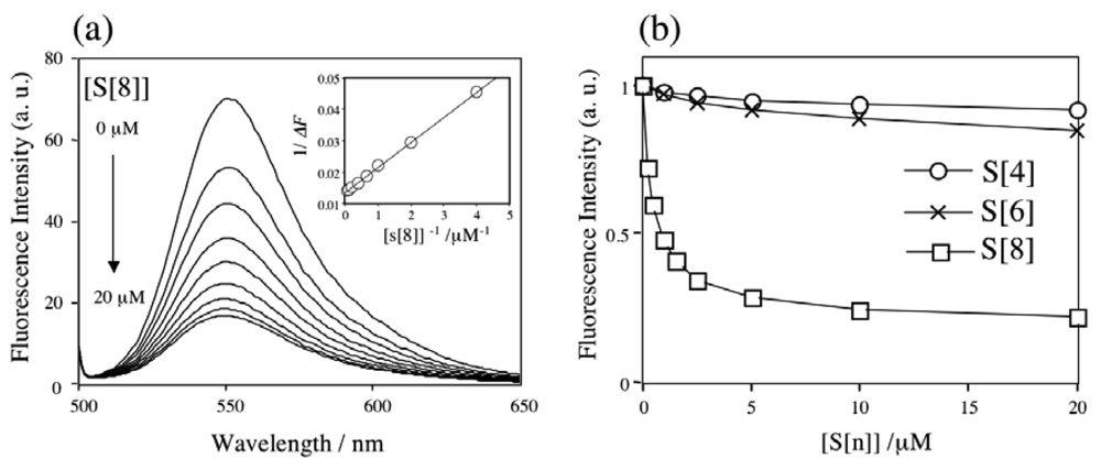 Fluorescence change of Rh6G by complexion with S[n] in 10 mM phosphate buffer (pH = 6.86). (a) Changes in the fluorescence spectra of Rh6G upon adding S[8]. Inset shows a plot of 1/ΔF and 1/[S[8]]. (b) Dependence of the fluorescence intensity of Rh6G on the concentration of S[n].
