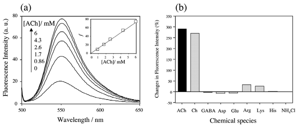 Fluorescence change of Rh6G (20 nM) by addition of ACh in the presence of 20 μM of S[8] in 10 mM phosphate buffer (pH = 6.86). (a) Changes in the fluorescence spectra of Rh6G upon adding ACh. Inset shows a plot of f and 1/[ACh]. (b) Fluorescence intensity change (%) of Rh6G by addition of ACh and other chemicals (6 mM): Ch; choline, GABA; 4-aminobutylic acid, Asp; l-asparatic acid, Glu; l-glutamic acid, Agr; l-arginine, Lys; l-lysine, His; l-histamine, and NH4Cl; ammonium chloride.