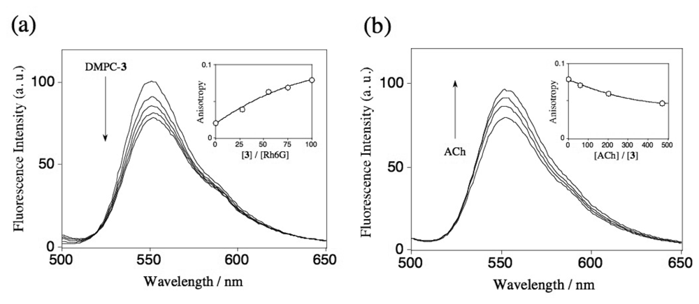 To examine the binding abilities of ACh by DMPC vesicles containing 1-3, competitive fluorophore displacement experiments using Rh6G were performed (Scheme 2b). We measured a steady-state fluorescence of Rh6G in the presence of DMPC vesicles containing 1-3 to check their binding abilities for Rh6G. Figure 3a shows the fluorescence spectra of Rh6G (20 nM) upon adding DMPC-3 vesicles. The fluorescence intensity of Rh6G is quenched with increasing the concentration of DMPC-3 vesicles. In the case of the DMPC vesicles containing 1 and 2, the addition of these vesicles causes only a slight change in the fluorescence spectra under the same experimental condition (data not shown). To confirm the binding of Rh6G to the DMPC-3 vesicle, we measured fluorescence anisotropy [22] of Rh6G. The inset in Figure 3a shows the dependence of fluorescence anisotropy on the ratios of [3]/[Rh6G]. Upon adding DMPC-3 vesicles to the Rh6G solution, the fluorescence anisotropy increases, indicating that Rh6G binds to the DMPC-3 vesicle membrane. Figure 3b shows the fluorescence spectra of Rh6G when ACh was added to the mixture of Rh6G and DMPC-3 vesicles ([3]/[Rh6G]=100). In this case, the fluorescence intensity of Rh6G increases and its fluorescence anisotropy decreases with increasing the concentration of ACh. This result suggests that Rh6G molecules bound at the DMPC-3 vesicle are replaced with ACh as shown in Scheme 2b. Based on the equations of (1) and (2), association constants for Rh6G-3 and ACh-3 complexes at DMPC membranes are determined to be 7.1×105 M-1 and 1.1×102 M-1, respectively. In the DMPC-3 system, fluorescence change in response to the binding of Rh6G is small in compared with the case of the homogeneous solution system used S[8] (Figure 1a). Even in the presence of excess amounts of DMPC-3 vesicles, the fluorescence of Rh6G was not completely quenched. This finding may suggest that a Rh6G molecule is not deeply included in the cavity of 3 in the DMPC-3 vesicle system.