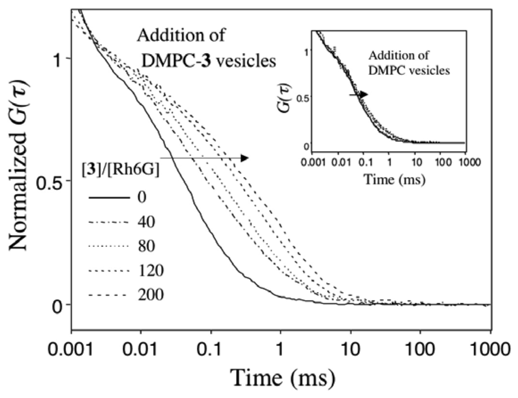 Figure 4 shows the G(τ) curves of Rh6G (20 nM) upon adding DMPC vesicles containing 5 mol % of 3. The G(τ) curve of Rh6G in the absence of the DMPC-3 vesicles is fitted to a single-component diffusion model, and the diffusion time of free Rh6G is calculated to be 0.04 ms. When the DMPC-3 vesicles are added to the aqueous solution of Rh6G, the G(τ) curve of Rh6G shifts to the right side with longer diffusion times.