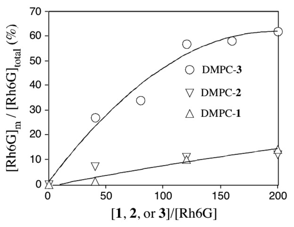 The fractions of free and membrane-bound Rh6G are calculated by the fit of G(τ) curves to Equation (3). Figure 5 shows the fraction of membrane-bound Rh6G ([Rh6G]m) in the presence of DMPC vesicles containing 1-3. When DMPC-3 vesicles are added to the aqueous solution of Rh6G, the fraction of [Rh6G]m significantly increases. In the presence of excess amounts of DMPC-3 vesicles ([3]/[Rh6G]=200), ca 60 % of Rh6G molecules is bound to the DMPC-3 membranes. When DMPC-1 or DMPC-2 vesicles are added, ca. 10 % of Rh6G molecules bind to the vesicles. In this case, however, the fraction of membrane-bound Rh6G is almost the same as those in the control experiment using DMPC vesicles.