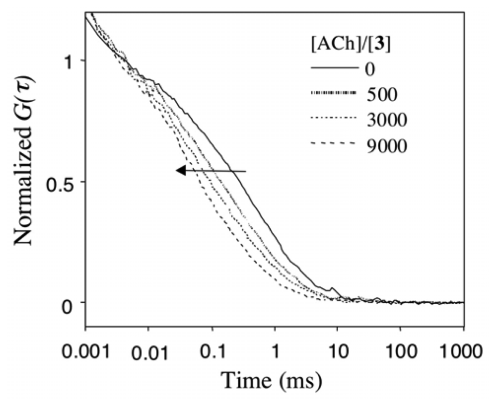 Figure 6 shows the effects of ACh on the G(τ) curve of Rh6G in a DMPC-3 vesicle dispersion. The G(τ) curve in the absence of ACh is fitted to a two component model, where 55 % of Rh6G is bound to the DMPC-3 vesicles and 45 % of Rh6G is free in solution. Upon addition of ACh, the G(τ) curve shifts to the left side with a decrease in diffusion times of Rh6G, indicating that Rh6G molecules bound at the DMPC-3 vesicle are replaced with ACh, and the fraction of free Rh6G is increased. In the presence of 9000 amounts of ACh over 3, ca. 50 % of membrane-bound Rh6G is replaced with ACh.