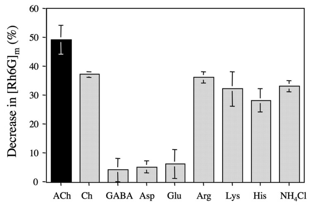 Decrease in [Rh6G]m (%) by addition of ACh and other chemicals (9000-fold amounts of 3) in the presence of DMPC-3 vesicles ([3]/[Rh6G] = 80, [Rh6G] = 20 nM): Ch; choline, GABA; 4-aminobutylic acid, Asp; l-asparatic acid, Glu; l-glutamic acid, Agr; l-arginine, Lys; l-lysine, His; l-histidine, and NH4Cl; ammonium chloride.