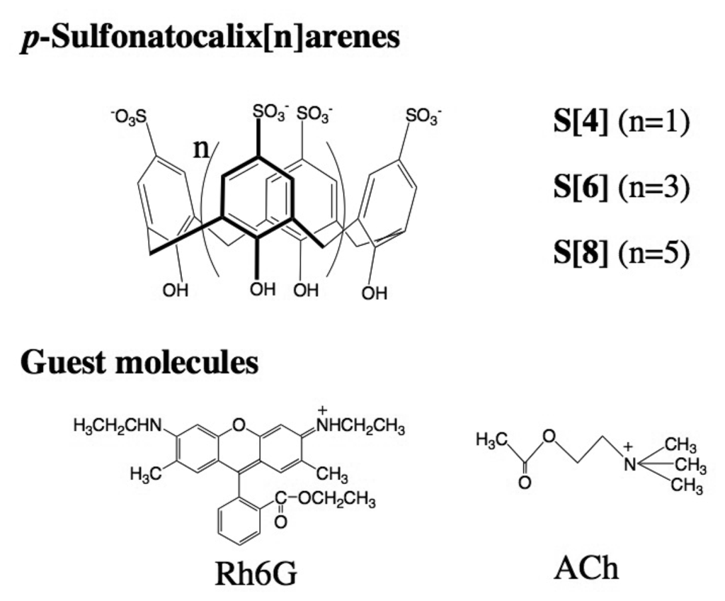 Molecular structure of p-sulfonatocalix[n]arenes and guest molecules, rhodamine 6G (Rh6G) and acetylcholine (ACh).