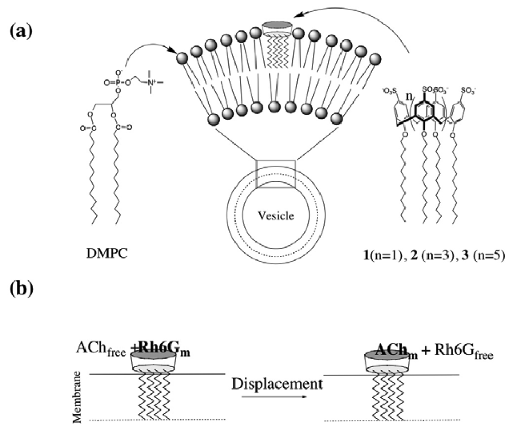 (a) Schematic representation of a DMPC vesicle containing p-sulfonatocalix-[n]arene derivatives 1-3. (b) Displacement of Rh6G bound at DMPC-(1-3) vesicles by ACh.