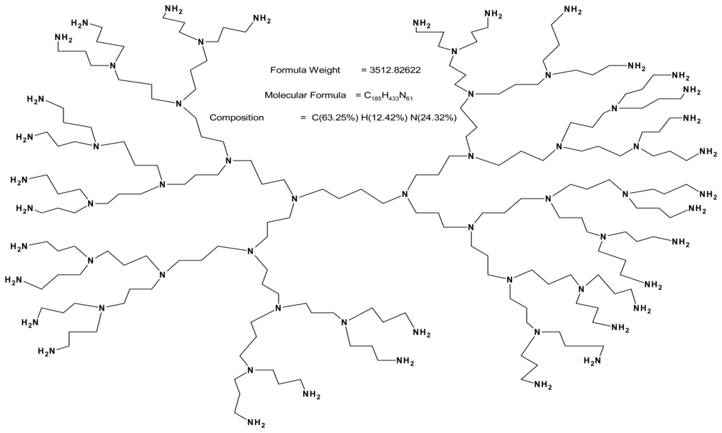 Structure of G4 Poly(propylene imine) dendrimer showing the peripheral primary amine and internal tertiary amine.