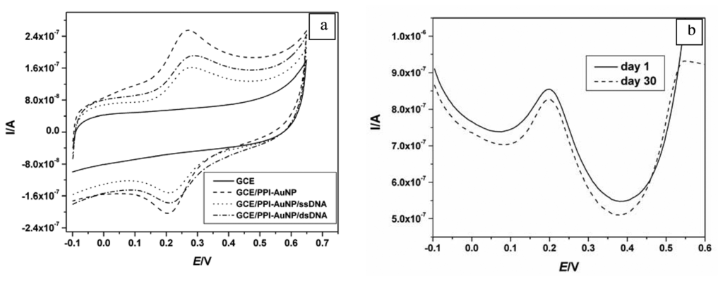 (a) CV of GCE/PPI-AuNP/ssDNA (developed with 2 μM thiolated ssDNA) and GCE/PPI-AuNP/dsDNA (i.e. response to 0.5 nM DNA target ssDNA) in PBS at 20 mV/s. (b) Differential pulse voltammograms of GCE/PPI-AuNP/ssDNA biosensor in PBS when stored for 30 days.