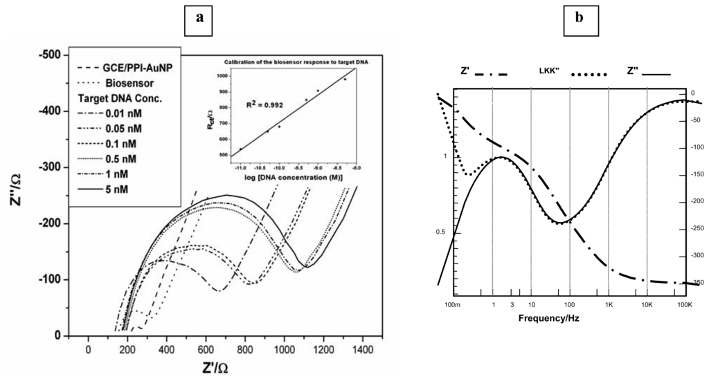 (a) Nyquist plots of the biosensor responses to 0.01 nM to 5 nM of target DNA in the presence of Fe(CN)63-/4- redox probe; (b) Kramer-Kronig (KK) plot for data validation. Z′ = experimental real impedance; LKK” = imaginary impedance calculated with the Kramer-Kronig equation; and Z” = the experimental imaginary impedance.
