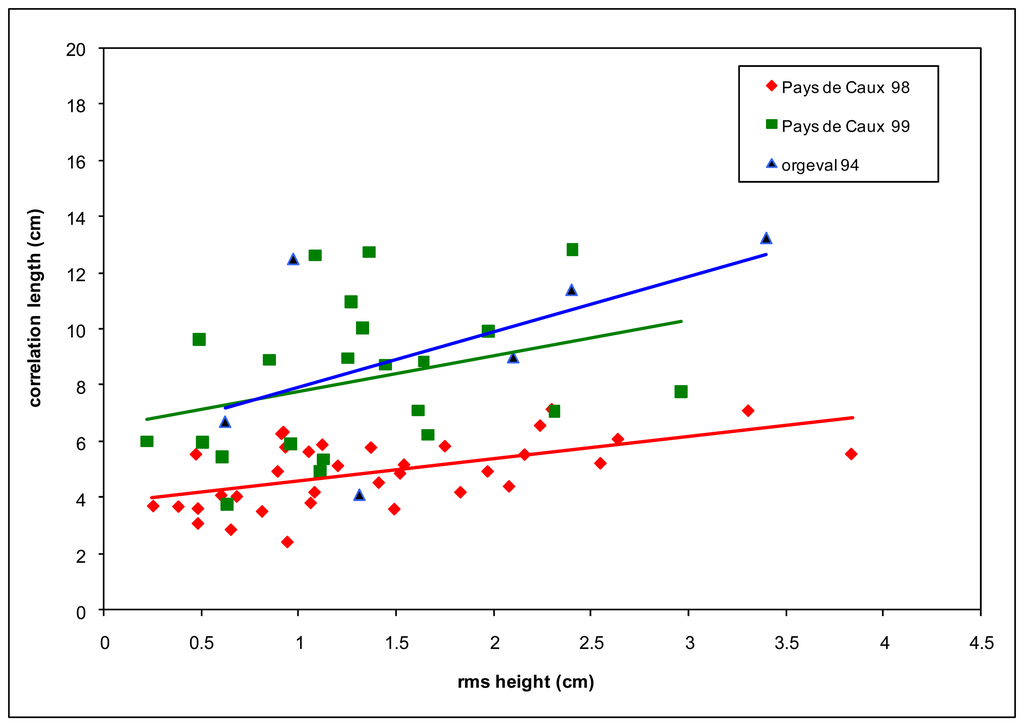 The rms heights (s) and correlation lengths (l) are extracted from the correlation function, computed from the measured soil profiles. Roughness measurements were made using a pin profiler (with a total length of 2 m and a resolution of 1 cm). The results illustrated in figure 1 show many types of agricultural soil, with s values ranging from 0.3 to 3.8 cm, and l ranging from 2.1 cm to 13.8 cm. We observe a correlation between these two parameters, for the studied test fields, with a tendency for the rms height to increase with correlation length, as illustrated by regression lines for the three databases.