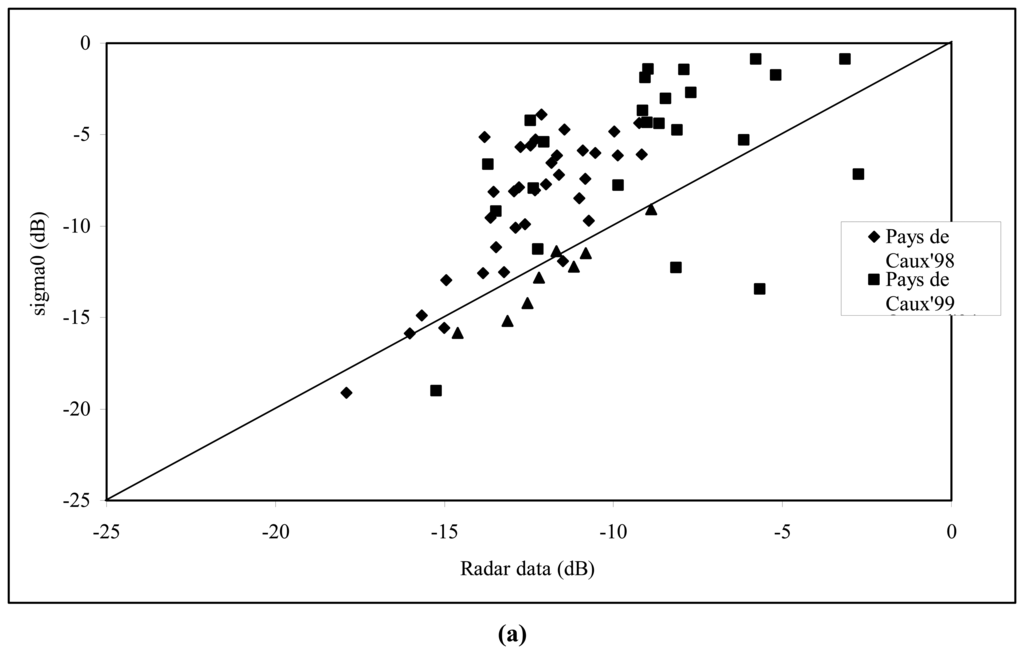 Secondly, past experimental studies have been designed to estimate surface moisture only, by adding different hypotheses to the surface roughness description. A linear relationship between surface moisture and backscattered radar signals has been proposed []. This approach was validated by a large number of experimental studies [, ]. It is generally considered to be a valid approximation for a given studied site. However, the coefficients needed to describe the linear relationship often vary from one watershed to another and also from one year to another, and thus need to be calibrated [, ]. For this reason, it is still very difficult to use this relationship for radar signal inversion, without making a considerable effort to obtain correct calibration of the coefficients.